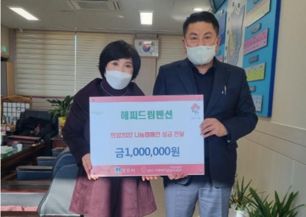 경주시 감포읍 해피드림펜션 정인숙 대표는 지난 18일 설 명절을 앞두고 어려운 이웃들을 위해 성금 1백만원을 감포읍행정복지센터에 기탁했다.