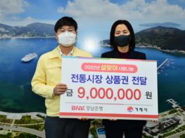 BNK경남은행 거제지점에서는 지난 19일 거제시를 방문하여 설 명절을 맞아 어려운 이웃을 위한 상품권 900만원을 거제시에 기부했다.