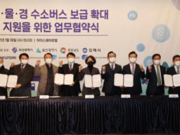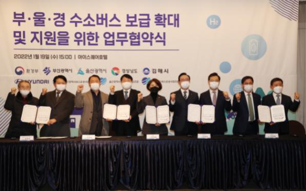 부산, 울산, 경남은 19일 오후 김해 아이스퀘어 호텔에서 부울경 수소버스 보급 확대 및 지원을 위한 업무협약을 체결했다.