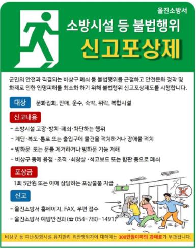 울진소방서(서장 송인수)는 17일부터 28일까지 2주간 소방시설 전원차단 및 방치, 비상구 폐쇄 등 소방시설 등에 불법행위 근절을 위해 집중 단속기간을 운영하고, ‘신고포상제’를 연중 운영한다고 밝혔다.
