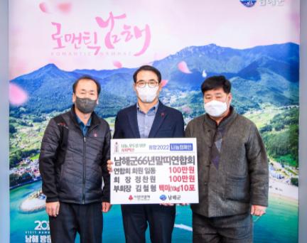 남해군의 대표적인 띠 모임인 66년생 말띠연합회는 지난 19일 군수실을 방문해 이웃돕기 성금 200만원과 백미(10kg) 10포를 함께 기탁했다.