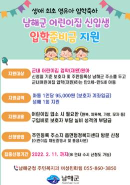 ‘어린이집 입학준비금 지원’은 어린이집을 이용하는 아동 보호자에게 보육 비용에 대한 부담감을 덜어주기 위해 추진되는 것으로, ‘아이 키우기 좋은 도시 남해군’ 조성 사업의 일환이다.