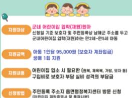 집중 신청기간은 오는 2월 11일까지이며 어린이집 재원증명서와 통장사본, 신청인 신분증을 지참하여 주민등록 주소지 읍면행정복지센터를 방문하여 신청하면 보호자의 계좌로 입금된다.