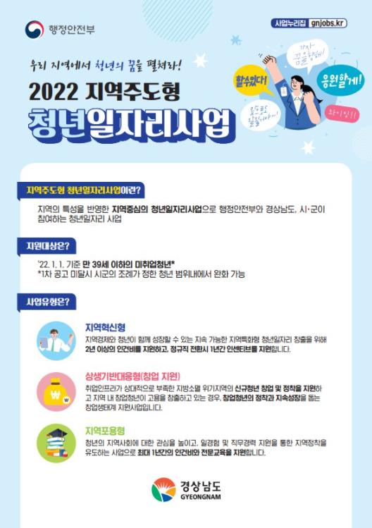 경상남도는 ‘2022년 지역주도형 청년일자리사업’의 참여기업 및 참여자를 모집한다.