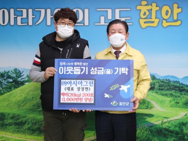 폐기물 처리 및 수집?운반 업체인 ㈜아시아그린·㈜아시아환경은 20일 군청을 방문해 관내 취약계층을 위해 사용해달라며 백미(20kg) 200포(1000만 원 상당)를 기탁했다.