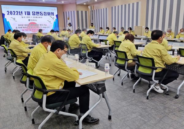 이날 회의에서 2022 코로나 극복을 위한 문화예술 활성화 사업, 소상공인·소기업 방역물품 지원금 지급, 외국인 대상 코로나19 예방접종 실시, 설맞이 환경정비 추진, 방역 및 민생 대응방안 점검, 설맞이 환경정비 및 어려운 이웃 위문, 산불 예방활동 점검 등에 대한 논의가 이뤄졌다.