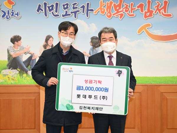 롯데푸드㈜가 성금 3백만 원을 김천복지재단에 기탁하며 코로나19로 어려움을 겪고 있는 김천시민들에게 도움이 되기를 바란다고 전했다.