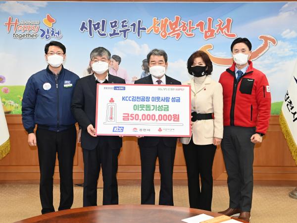 ㈜KCC는 지난 20일 김천시 지역의 저소득층 가정과 소외된 이웃을 위해 써달라며 김천시청을 직접 찾아 성금 5천만 원을 전달했다.