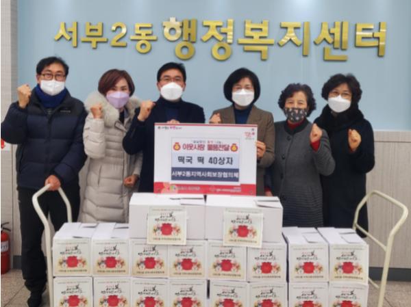 이번 설 명절 떡국 떡은 서부2동지역사회보장협의체 위원들의 회비로 모은 협의체 사업비로 마련되었으며 위원들이 직접 독거노인 가구를 방문해 떡국 떡을 전달하며 새해 인사를 나누고 안부를 살피는 시간을 가졌다.