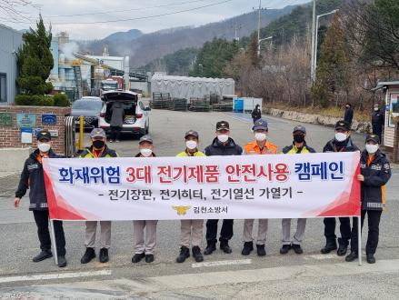 전우현 김천소방서장은 “코로나19 확산으로 주거시설 등 실내활동이 많아 겨울철 전기장판 등 난방용품 사용 부주의로 인한 화재가 많이 발생한다”며 “전기제품을 사용할 때는 반드시 규격제품 사용 및 안전수칙을 철저히 지켜 겨울철 화재를 예방하여 주시길 바란다”고 전했다.