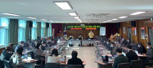 회의는 교육공동체 소통과 참여로 협력적 회의 문화 확산과 교육기관별 역할을 모색해보는 시간으로써 △2022. 단위학교 기초학력 보장 및 교육 회복 활성화 △학교 현장 맞춤형 “학교정보화업무 지원” 강화 △심리·정서 회복을 위한 맞춤형 지원 △경남 미래교육과 학교의 미래 직무연수 운영 △2022. 수요자중심의 초등돌봄교실 확대 운영 △학교통합지원센터 운영 내실화 방안 △2022. 학교 밖 누리교실 확대 방안 △광역통학구역 시행에 따른 통학편의 지원 등 1월 경남정책관리자회의 주요내용과 학교장회의 자료 전달과 교육현안을 협의하는 시간으로 진행됐다.