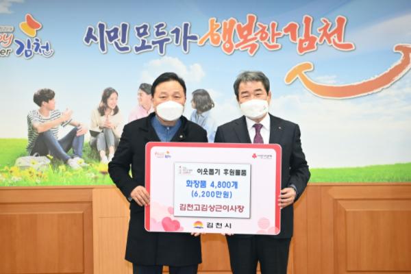 이날 전달식에서는 김상근 김천고 이사장이 대표로 재직하고 있는 ㈜대화씨앤에프의 화장품 2종(바디로션·크림) 4,800개(금6천2백만원 상당) 물품이 기부되었다. 김천시 공동모금회 ‘사랑의 열매’로 기부된 해당 물품은 관내 노인복지시설 42개소에 분배되었다.