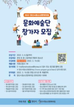 참가자 모집은 3월 6일까지이며 관내 초?중?고등학생 연령의 청소년이면 누구나 신청이 가능하다. 문화예술단 모집에 대한 자세한 사항은 양산시청소년광장 홈페이지 공지사항에서 확인 할 수 있다.