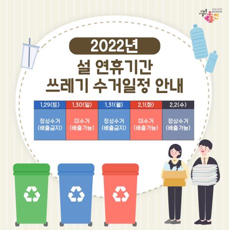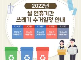 설 연휴 동안 생활쓰레기는 1월 30일과 설 당일인 2월 1일은 수거하지 않으며, 나머지 연휴 기간에는 정상 수거하므로 일몰 후 배출하면 된다.
