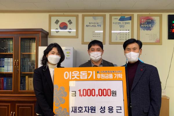 재호자 성용근 대표는 21일 서창동행정복지센터를 방문해 나유순 동장에게 소외된 어려운 이웃에게 써달라며 성금 100만원을 기탁했다.