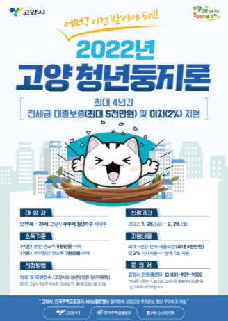 ‘고양 청년둥지론’은 한국주택금융공사와 NH농협은행과 협약해 무주택 청년가구(연 200가구)를 대상으로 최대 4년간 최대 5천만 원의 전세보증금 대출추천 및 대출이자 2%(최대 100만원)를 지원해 주는 사업이다.