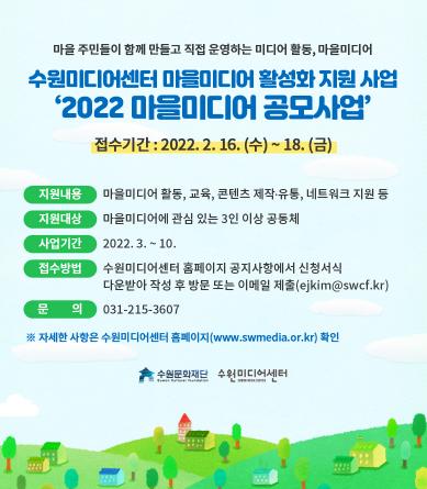 수원문화재단 수원미디어센터는 ‘2022 마을미디어 공모사업’을 진행한다.