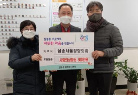 고양시 덕양구 삼송1동 행정복지센터는 지난 21일, 다가오는 설 명절을 앞두고 지역사회의 어려운 이웃들을 위해 삼송서울정형외과(원장 김정재)에서 5만원권 상품권, 총 300만원을 삼송1동에 기부했다고 밝혔다.
