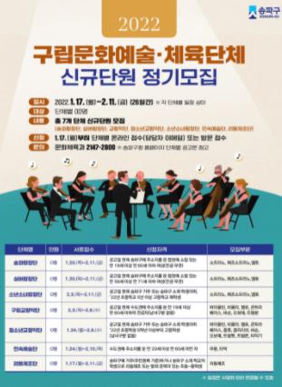 송파구가 구립 문화예술·체육단체에서 활동할 신규 단원을 2월 11일까지 모집한다고 밝혔다.