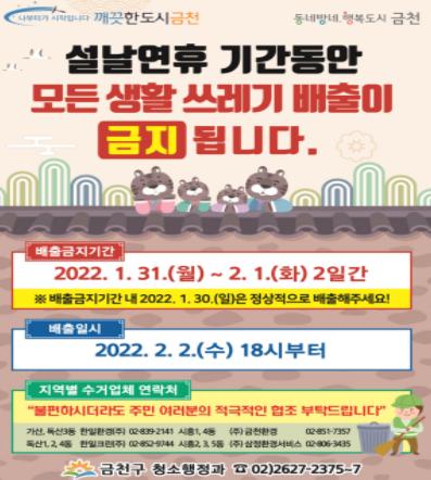 유성훈 금천구청장은 “설날 연휴 기간 중 생활쓰레기 수거 중단으로 주민 여러분께서 불편하시겠지만, 서로 배려하고 모두가 즐거운 명절을 보낼 수 있도록 주민 여러분의 많은 이해와 적극적인 참여를 부탁드린다”라고 말했다.