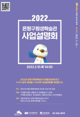 은평구와 은평구평생학습관은 오는 2월 10일 오후 2시 은평구평생학습관 유튜브 채널에서 ‘2022년 은평구평생학습관 사업설명회’를 실시간 생중계한다.