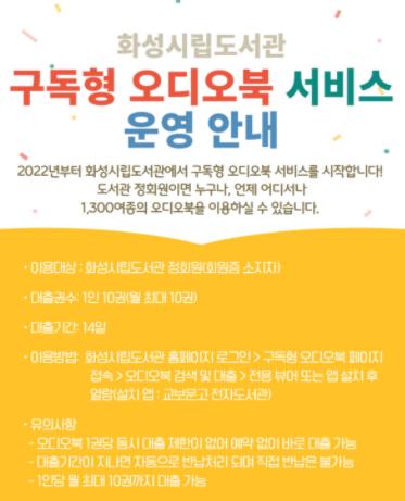화성시 도서관에서는 이용자가 도서관을 방문하지 않아도 많은 전자자료를 볼 수 있도록 ‘구독형 오디오북’ 서비스를 1월 3일부터 신규로 도입하여 제공하고 있다.