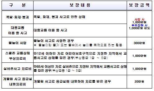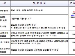 올해 갱신된 생활안전보험은 안전 사각지대 해소를 위해 물놀이 사망, 개물림 사고 등까지 보장영역이 확대·개편됐다. 보장 항목은 ▲폭발·화재·붕괴로 인한 사망 및 후유장해 ▲대중교통 이용 중 사망 및 후유장해 ▲스쿨존 교통상해 부상치료비(1~5등급) ▲실버존 사고 치료비(1~5등급) ▲물놀이 사망 ▲개물림 사고 응급실 내원치료비 등이다.