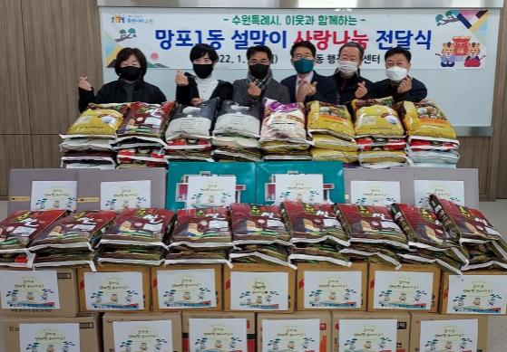 수원시 영통구 망포1동은 지난 24일 행정복지센터에서 민족 고유의 명절인 설을 맞이하여 어려운 이웃을 위한 ‘사랑나눔 후원품 전달식’을 개최했다.