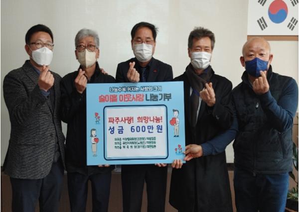 이들 3개 단체는 어려운 여건에도 더불어 사는 파주읍을 위해 각 단체의 회원과 단체장이 총 600만원의 성금을 모았다.