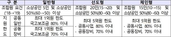첫째, 공동사업 의 경우, 협동조합의 규모화를 촉진하기 위해 조합원수·출자금·매출 등 조합의 규모와 역량에 따라 일반형 조합은 최대 2억원, 선도형·체인형 조합은 최대 5억 원까지 차등화해 지원한다.