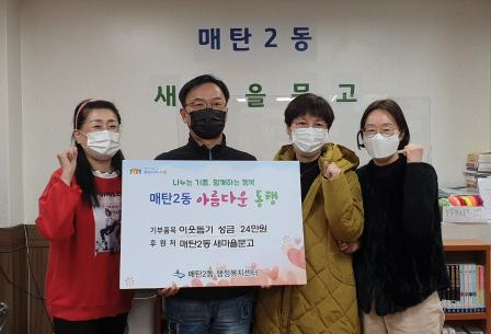 수원시 영통구 매탄2동 새마을문고(회장 노효숙)는 지난 24일, 설 명절을 앞두고 관내 소외된 취약계층을 위해 24만원의 성금을 후원했다.