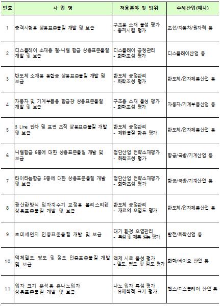 이 사업은‘소재·부품·장비 경쟁력 강화대책’에 따라 공급안정성을 확보하고자 하는 반도체, 디스플레이, 기계·금속, 기초화학 등 100대 핵심 전략품목의 신뢰성 평가 지원을 위해 설계됐으며 금년도에는, 반도체 공정용 표준가스, 고순도 실리카 등 수출규제를 극복하고 반도체, 디스플레이 등 첨단 소재·부품의 자립화에 필요한 표준물질을 우선 개발하도록 40개 과제를 지정해 지원한다.