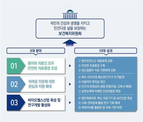 2019년 보건복지위원회의 주요 입법 성과를 “환자와 의료인 모두 안전한 의료환경 조성”, “어려운 이웃에 대한 관심과 지원 확대”, “바이오헬스 산업 육성 및 연구개발 활성화”등 3대 분야 10개 성과로 제시했다.