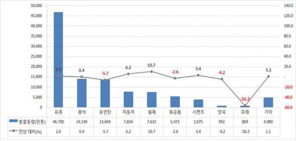 유류는 광양항의 수출입 물동량 및 대산항의 수출 물동량 증가 등의 영향으로 전년 대비 2.0% 증가했다.