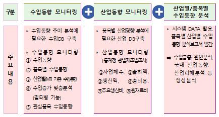 무역구제 수입동향 시스템은 관세청의 수입통계, 통계청의 산업통계 등 관련 수입·산업동향 DB를 종합적으로 연계한 시스템으로 품목별·국가별 수입추세, 수입품목별 산업동향 등을 업계에 제공함으로써 수입증가에 따른 국내 산업영향을 분석할 수 있는 수입 모니터링 시스템이다.