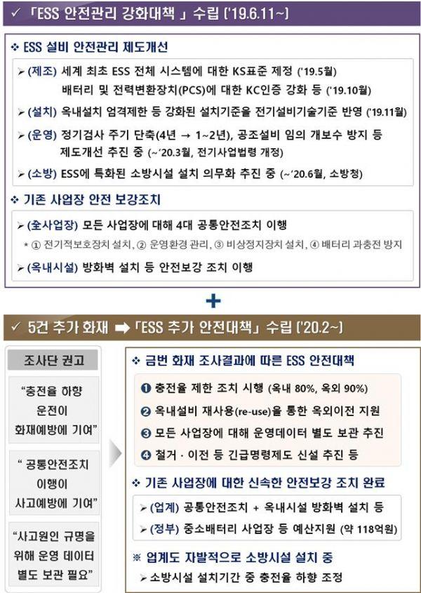 충전율 제한조치, 옥내설비의 옥외이전 지원, 운영 데이터의 별도 보관을 위한 블랙박스 설치, 철거·이전 등 긴급명령제도 신설 등 추가 안전대책을 추진하고 ‘ESS 안전관리 강화대책’ 등에 따라 공통안전조치 및 옥내시설의 방화벽 설치 등 현재 이행 중인 안전조치를 신속하게 완료할 계획이라고 전했다.