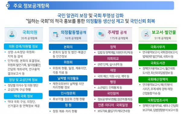 이들 정보공개 항목은 역대 국회 정보의 활용성을 강화할 수 있도록‘아카이브 체계’를 통해 데이터베이스로 축적해 관리할 예정이다.