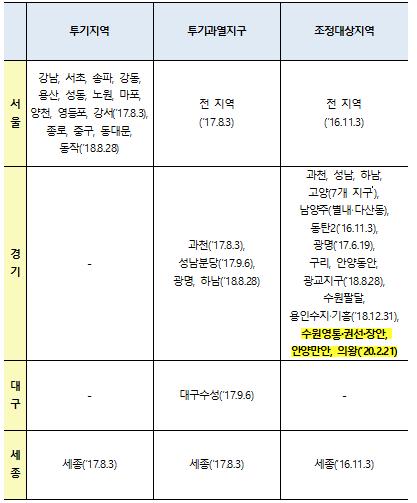 최근 집값 급등으로 시장 불안이 지속되는 경기 일부 지역에 대해 투기 수요 유입을 차단하고 실수요자를 보호하기 위해 주거정책심의위원회 심의·의결을 거쳐, 수원시 영통구, 권선구, 장안구 및 안양시 만안구, 의왕시를 조정대상지역으로 신규 지정한다.