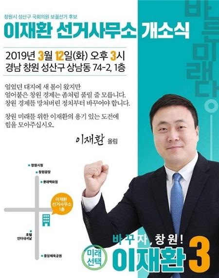 12일 오후 3시, 바른미래당 창원시성산구 국회의원 보궐선거 이재환 후보의 후보사무소 개소식이 열린다.