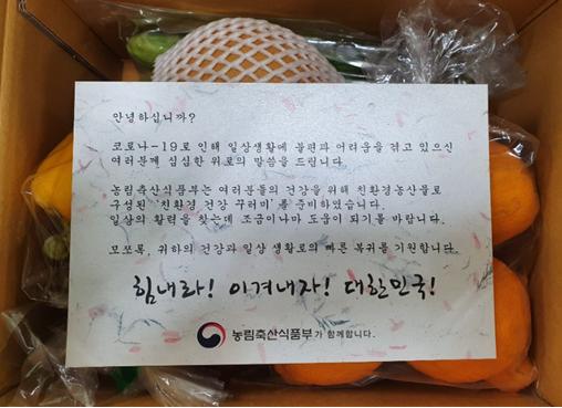 코로나19 자가격리자 7,509명 대상 친환경 과일·채소 등으로 구성된 꾸러미를 무상으로 공급하였으며, 이를 위해 피해 농가가 생산한 친환경농산물 37톤을 구매하였다.
