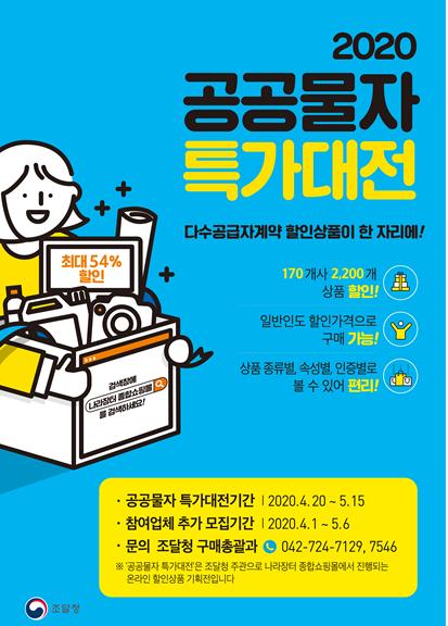 조달청(청장 정무경)은 4월 20일부터 5월 15일까지 나라장터 종합쇼핑몰에서 최대 54%까지 할인된 상품을 판매하는 '공공물자 특가대전'을 개최한다.