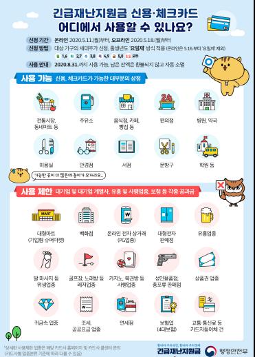 윤종인 행정안전부 차관은 “긴급재난지원금은 지역 내 소비진작과 골목경제 활성화를 위해 사용처에 제한을 둘 수밖에 없었다”며, “국민들께서 사용하시는데 어려움이 최소화되도록 카드사 홈페이지와 지자체 홈페이지 등을 통해 긴급재난지원금 사용처를 계속해서 알려드리겠다.”고 설명했다.