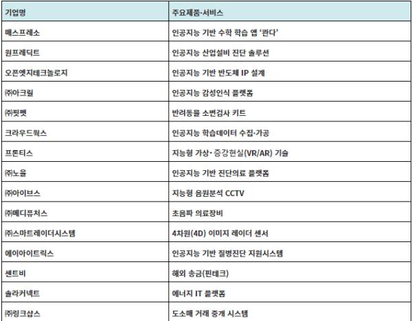 인공지능 기반 수학 문제풀이 에듀테크 기업 매스프레소, 산업설비의 고장 위험성과 잔여 수명을 예측·분석하는 원프레딕트, 인공지능 기반 반도체 설계자산(IP) 기업인 오픈엣지테크놀로지 등 정보통신기술(ICT) 분야의 혁신 기업들이 글로벌 성장 잠재력과 우수한 기술력을 인정받아 글로벌 ICT 미래 유니콘 육성사업(ICT GROWTH 사업) 지원기업으로 선정되었다.