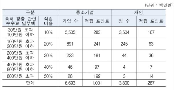 이렇게 적립된 지식재산포인트는 특허청에 납부하는 각종 수수료나 등록료를 납부할 때 사용할 수 있어 개인·중소기업의 특허 수수료 등의 부담을 줄일 수 있을 것으로 기대된다.