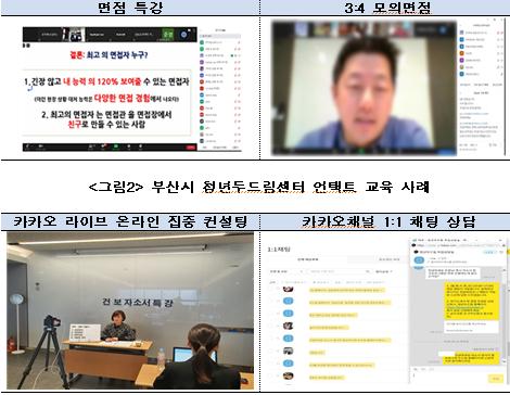 송수종 고용정보원 연구위원에 따르면, 각 지자체 청년센터에서는 ▲온라인 취업멘토링.생방송 특강 실시 ▲카카오 채널을 통한 정보 제공 등 각종 온라인 플랫폼을 적극 활용하는 방식으로 대응하고 있다.