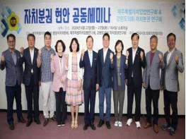 제주특별자치도의회 제주특별자치입법연구회(대표 정민구 의원)는 전국시도의회의장협의회 후원으로 6월 22일(월) ~ 23일(화) 양일간 의사당 소회의실에서 강원도의회 자치분권 연구회(회장 허소영 의원)와 함께 「자치분권 현안 공동세미나」를 개최했다.