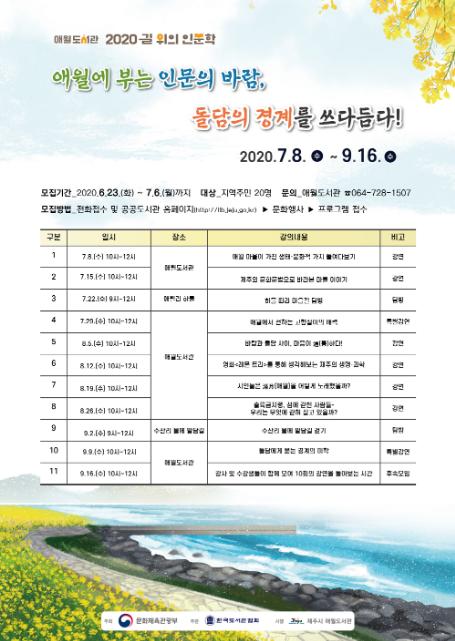 제주시 애월도서관은‘애월에 부는 인문의 바람, 돌담의 경계를 쓰다듬다!’라는 주제로 2020년 『길 위의 인문학』을 운영한다.