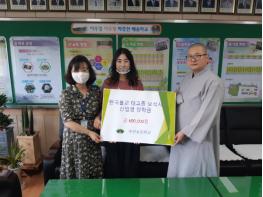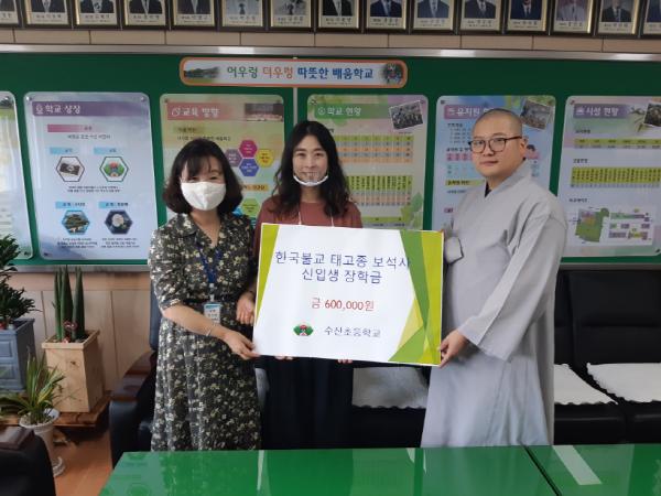 수산초등학교(교장 강인자)는 7월 20일(월) 교장실에서 한국불교 태고종(수산1리 소재) 보석사 주지 스님으로부터 장학금 육십만원을 기탁받았다고 밝혔다.