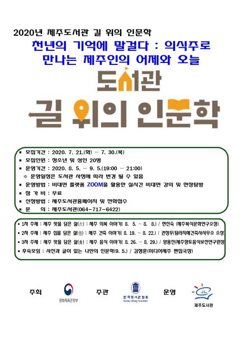 제주도서관(관장 김경희)은‘천년의 기억에 말 걸다 : 의식주로 만나는 제주인의 어제와 오늘’이라는 주제로 2020년 도서관‘길 위의 인문학 사업’공모에 선정되어 참가자를 모집한다.