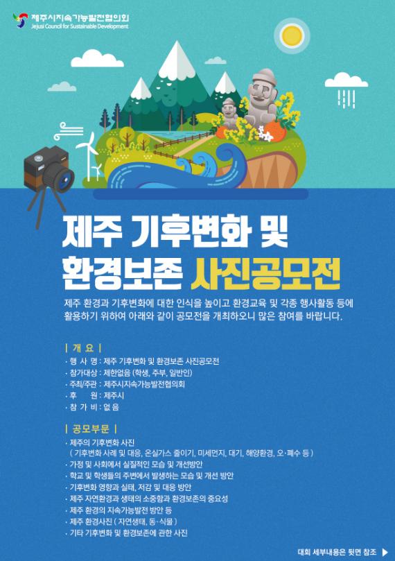 공모부문은 ?제주의 기후변화 모습 및 개선방안 ?기후변화 영향과 실태, 대응방안 ?제주 자연환경 모습, 환경보존의 중요성 ?제주환경의 지속가능발전 방안 등으로 제주시 지역에서 촬영한 사진을 제출하면 된다.